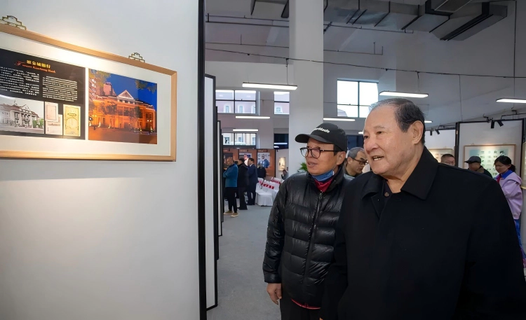 据策展人、天津艺术史学会会长齐珏介绍,耄耋之年的王述祖先生自号“不闲客”,深耕天津历史文化,以竹枝词为载体挖掘城市底蕴。其作品不仅是笔墨艺术的呈现,更饱含滚烫的爱乡之心。画家高桂鸿女士为诗词配套创作的《杨柳青》《桃花堤》等水墨画,以笔墨呼应诗词意境,陈绍泉先生聚焦解放北路“东方华尔街”的摄影作品,定格百年金融街的光影变迁,串联起城市金融记忆。通过竹枝词唤醒城市记忆,用书画再现家乡风貌,以影像记录时代变迁,让“爱天津”从情感共鸣转化为文化实践。三类作品互为补充,让津沽文化可赏可感。此外,著名书法家王树秋先生为此次展览题写展题“我爱天津”。