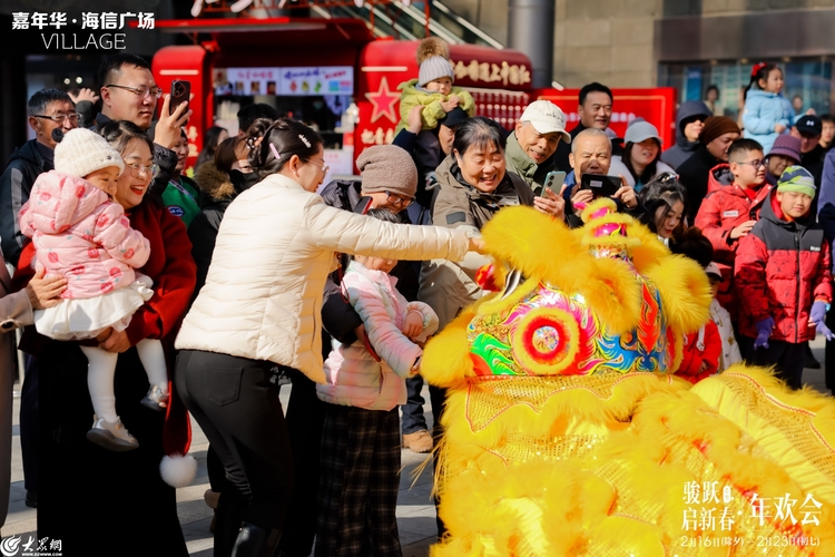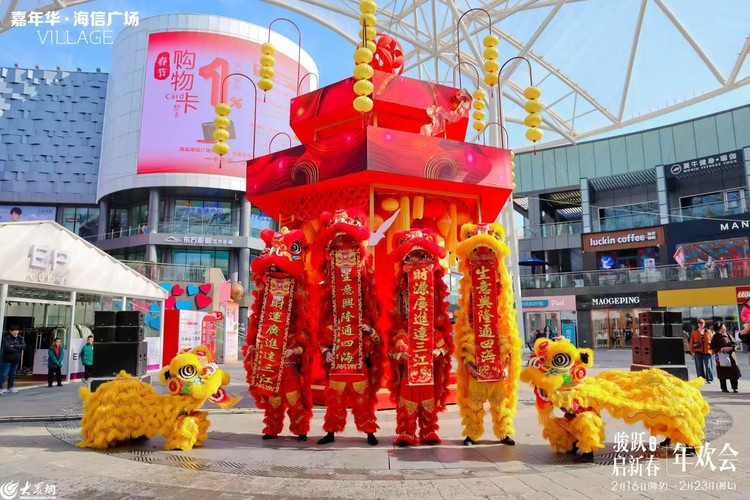 嘉年华·海信广场VILLAGE内,重磅打造的8米巨型国风花灯“龙腾祥瑞”成为海岸线上最吸睛的祈福打卡点,与“琴岛之星”摩天轮新春限定灯光秀交相辉映。每当夜幕降临,还有千平方米的裸眼3D大屏轮播定制新春动画,与天鹅河畔的点点河灯虚实结合,构建出震撼人心的沉浸式消费场景,让市民游客在光影流转中感受最浓郁的海滨年味。